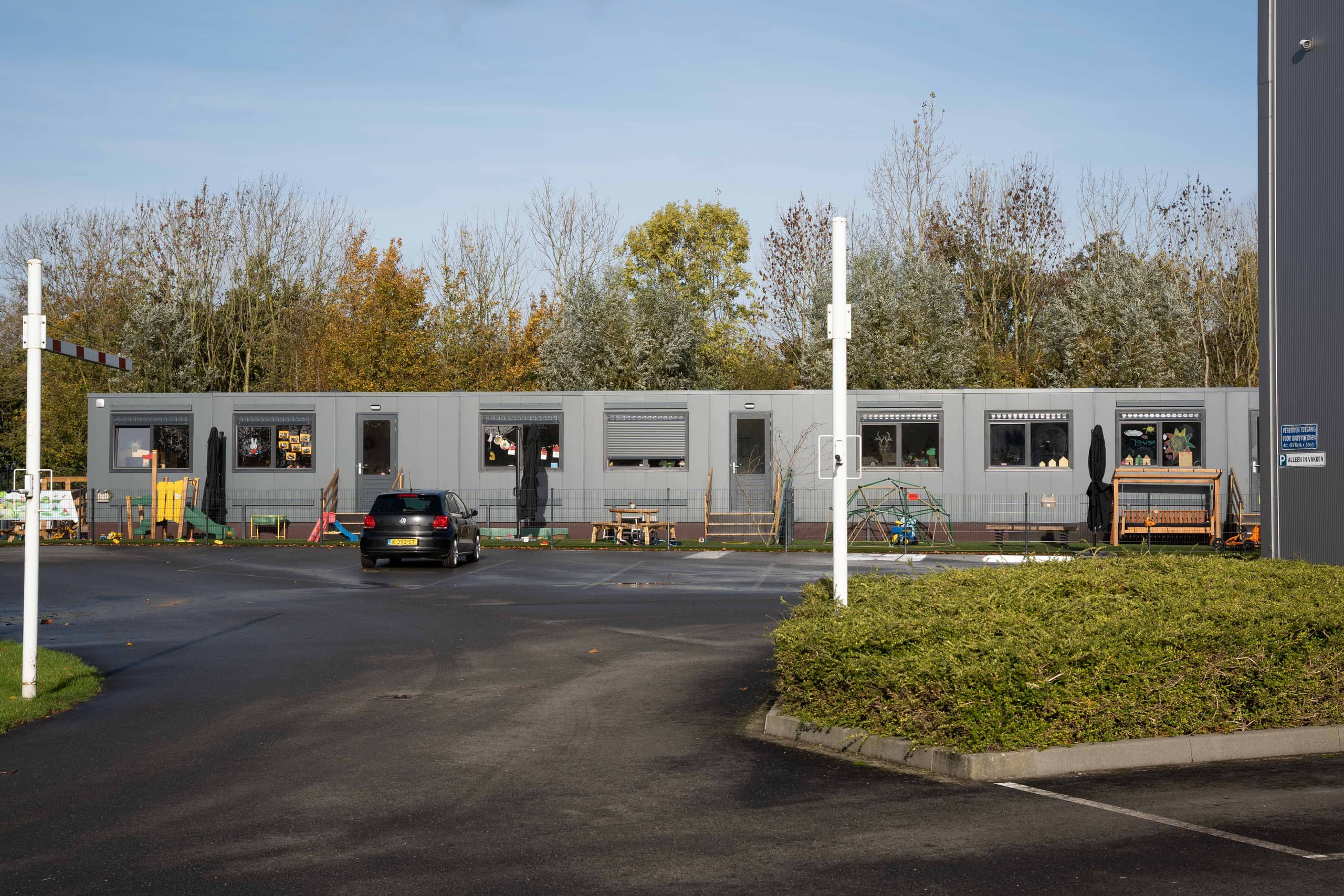 Achter het gebouw bevindt zich een grote parkeerplaats. Dit bleek de meest geschikte plek voor het plaatsen van de units voor de tijdelijke opvang. Marieke: ’Qua vervoer is dit natuurlijk perfect en handig voor de ouders. Daarnaast bieden we ook buitenschoolse opvang aan de kinderen die op de school hiernaast zitten. Dan is het mooi dat het tijdelijke gebouw zo dichtbij is.’